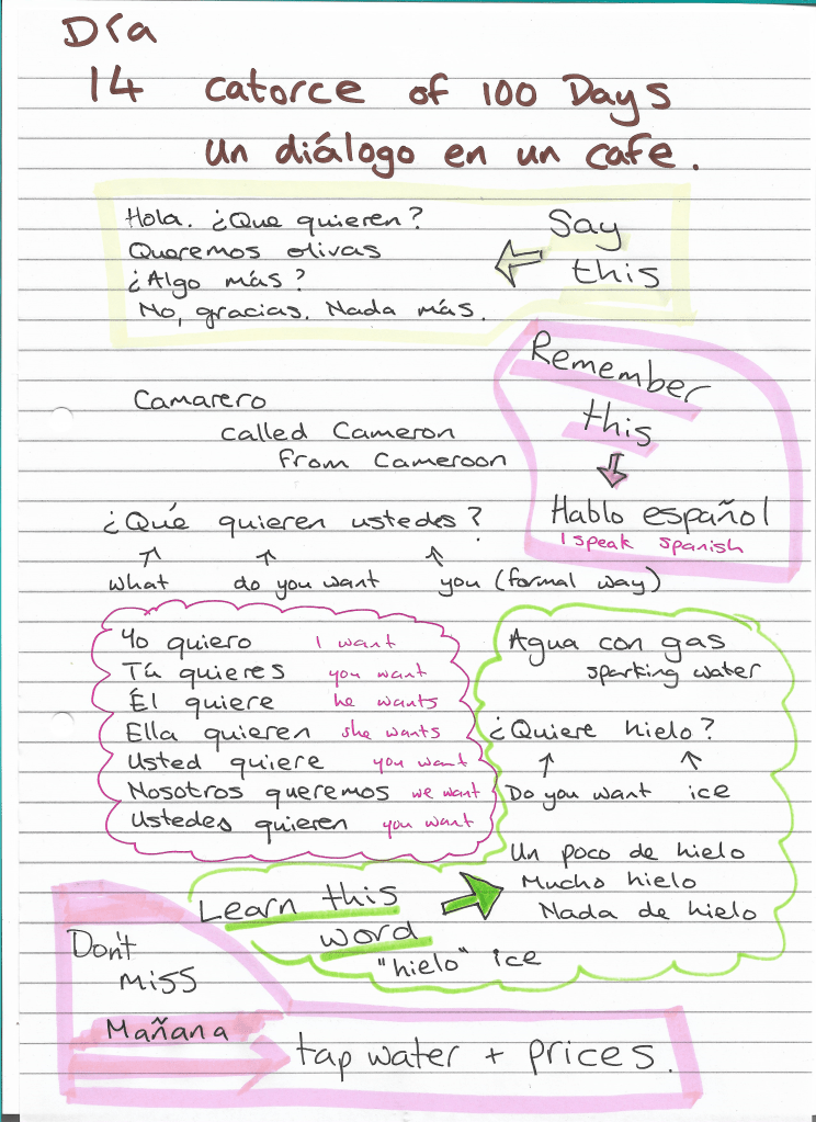 Day 14: Dialogue in a café 100 Days of Spanish Link to lesson menu Relaja y mira el video de hoy! Quermos = We want Si quieres, escribe notas If you want, write notes … Ice = hielo Come back mañana to ask about prices and to ask for free water Click the link to Day 15 Share this: Click to share on X (Opens in new window) X Click to share on Facebook (Opens in new window) Facebook Like Loading...