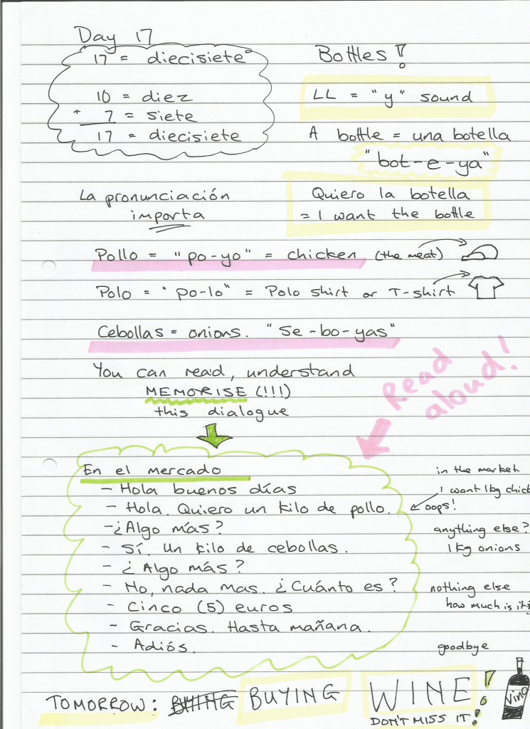 When you have learned this lot, go to tomorrow, day 18! It is another great lesson, and there is less to learn. Just the letter V making a “b” sound, and buying a bottle of wine. Click the link to see me there!