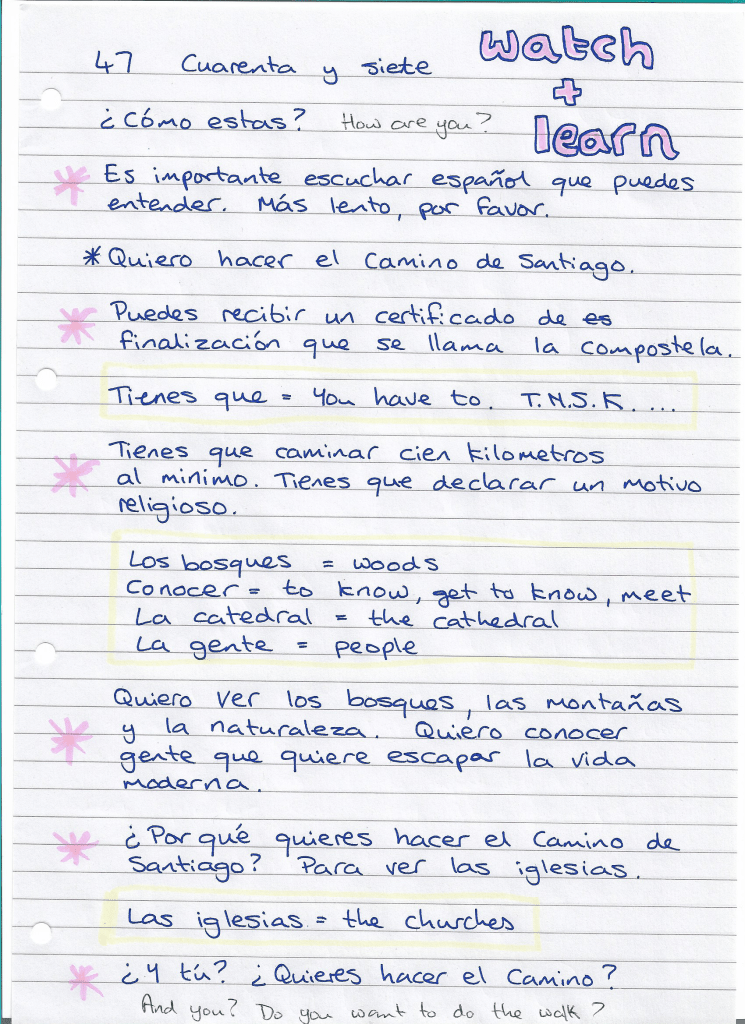 In this Spanish lesson learn how to ask people to speak more slowly. Increase your vocabulary with reasons for doing el Camino: religious motives, nature … the woods and mountains, to see churches, to meet people and to escape modern life.