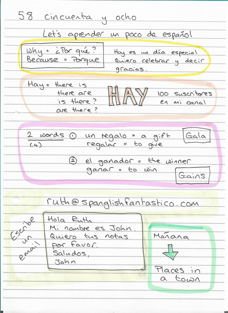 Today is a celebration of you, and I have gifts, regalos, for everyone. On Day 49, cuarenta y nueve, I talked about reading. In 12, doce, comentarios, people said, “Me gustaría leer este libro.” Ahora que tengo cien suscritores en mi canal quiero regalar un libro a todos. Unfortunately, I can only send a paper copy to one lucky ganador, but I don’t want to leave anyone out, porque quiero decir “GRACIAS” a todos. So I am giving away the first 50, cincuenta días de mis notas, in one PDF. I am in the process of writing a book using these notas, y en mi opinión estas notas puede ser realmente útil para ti, y muchas personas have told me they love these notes. Por eso he decidido regalar mis notas a ti, porque todos son ganadores.