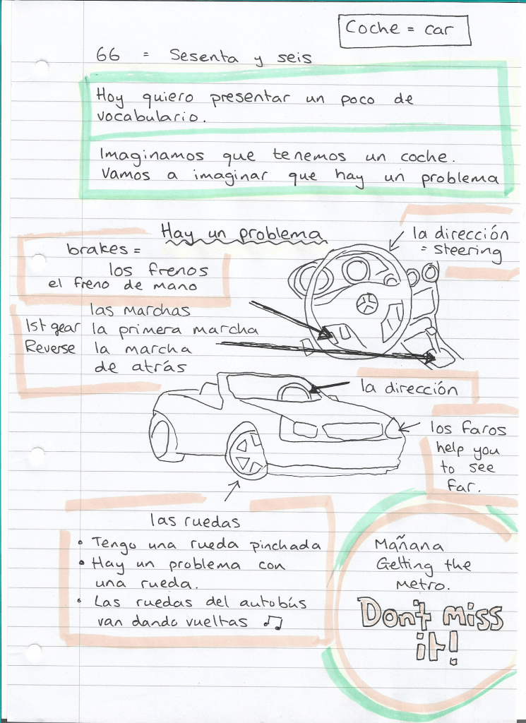 Then test yourself! Draw a car and use arrows to label the brakes, lights, steering, gears and wheels. Share your drawings with us on 100 Days of Spanish at Facebook. Would you like to look at my notes?