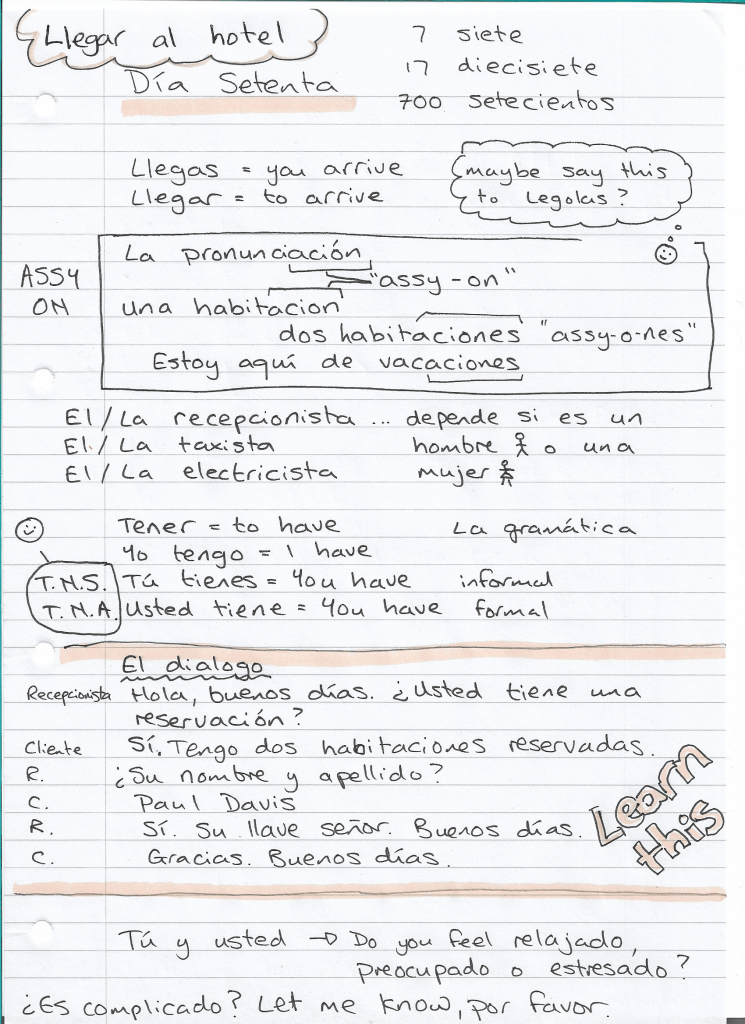 Today is day 70, setenta. We arrive at a hotel (what is the word for arrive?) Get your pronunciation perfect for words like room (habitación), reservación, vacaciones by getting your assy-on! Then build un diálogo con la recepcionista (or el recepcionista … do you know other words like this?) Decide which words, frases y momentos te han gustado más, and write it down, maybe in the comments below the video on YouTube …